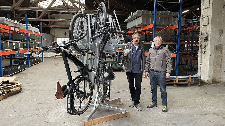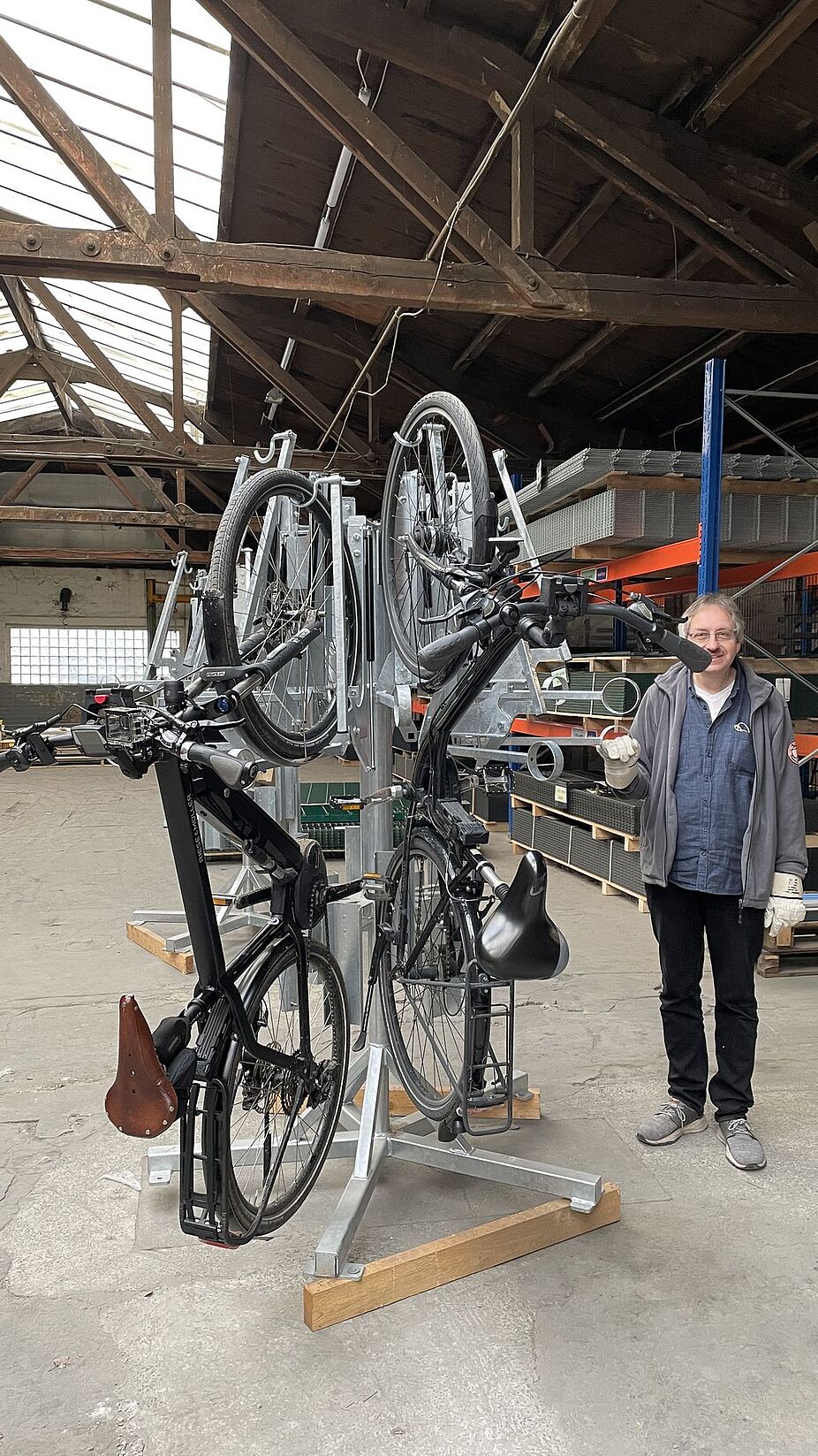 Die aktuellen Häuser haben wieder Platz für 12 Räder, allerdings sind sie mit einem Hebeliftkarussell ausgestattet. So können die Räder und insbesondere auch Pedelecs besser eingehängt werden. Auf dem Foto und im Video sind die zusammengebauten Rad-Karussells mit der Hebe-Funktion zu sehen.