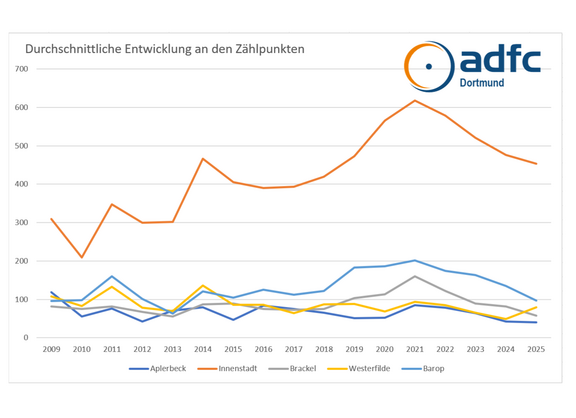Entwicklung der Anzahl der Fahrradfahrenden an fünf definierten Messpunkten im Stadtgebiet Dortmund