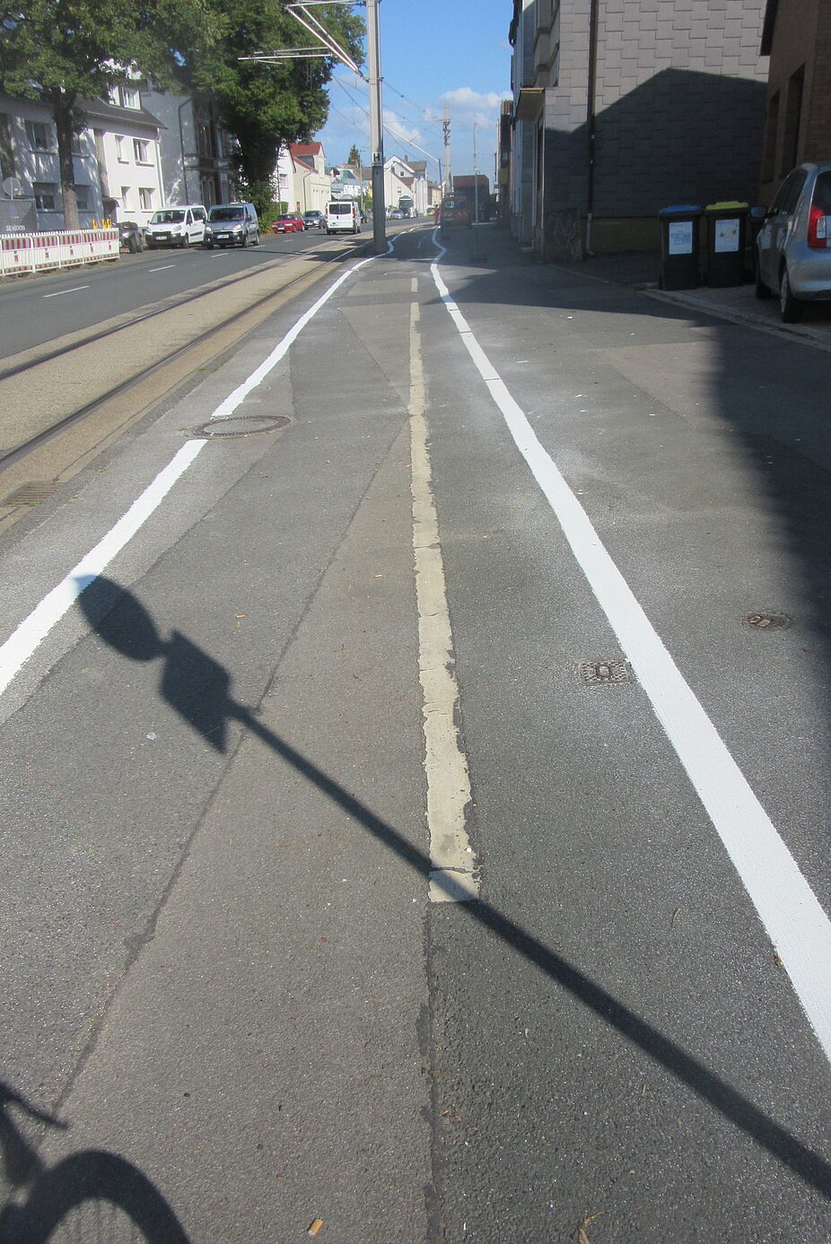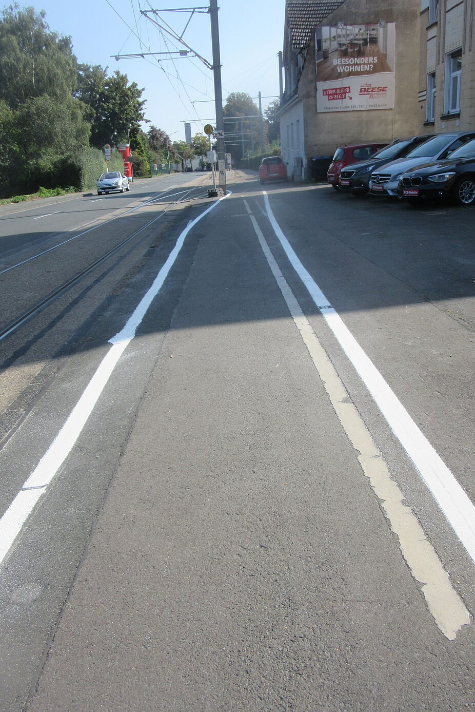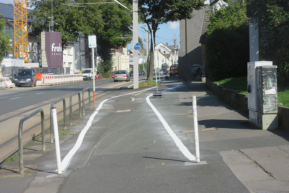 Jetzt wurde der Radweg neu und wo es möglich war, breiter markiert als zuvor. Beginn Haus Nr. 161 nun 2 m breit. Kurz vor Querstraße Werswand gab es zuvor einen Parkstreifen direkt neben der Fahrbahn. Radfahrende hatten einen gemeinsamen Fuß-/Radweg und mussten um Pfosten mit Verkehrsschildern herumfahren (Foto alt). Jetzt führt der abmarkierte Radweg direkt neben der Fahrbahn entlang, kein Slalom-Fahren mehr um die Pfosten. Das Parken wurde hier zugunsten des Radverkehrs beseitigt. Daher muss noch der Pfosten mit dem Schild "Parken auf Gehwegen" entfernt werden. Auch im weiteren Verlauf auf dem Wickeder Hellweg wurde der Radweg durch Neumarkierung verbreitert. Insgesamt entfielen, wie das Tiefbauamt mitteilte, durch die Neumarkierung etwa zwei Drittel der bisherigen Parkplätze.