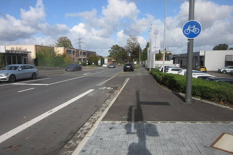 Völlig fehlerhaft sind die Radwegführungen jeweils am Ende der Radfahrstreifen, weil sie auf die Bürgersteige führen. So führt der Radfahrstreifen auf der Planetenfeldstraße hinter der Kreuzung direkt zu auf die Ausfahrt vom Autohaus Hülpert. Und hier steht eine Laterne auf dem Weg, so dass Radfahrende direkt am Grundstück, ganz nah an der Ausfahrt entlang fahren müssen. Im Verlauf der Straße gibt es weitere Grundstücksausfahrten und Engstellen durch Laternen.
