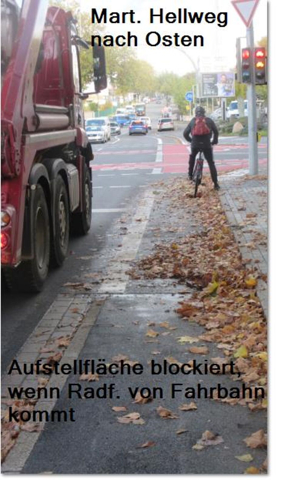 Eine bessere Lösung wäre vor den beiden kurzen Radfahrstreifen werden jeweils die dortigen Parkbuchten zum Teil als Radfahrstreifen umgestaltet, so dass die Streifen wesentlich länger vor der Kreuzung werden und die Zufahrt auf diese durch wartende Autos kaum zugestellt werden. Für den ADFC sind die Fehlplanungen unverständlich und es besteht dringender Handlungsbedarf. Die als notwendig beschriebenen Verbesserungen sind schnellstmöglich vorzunehmen. Die ausführliche Stellungnahme steht zum Download bereit.