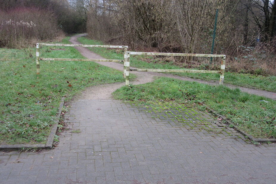 - Brennaborstr, westl. Hauert ,Weg in Grünbereich Meilengraben. Schranke kann sofort ersatzlos entfernt werden, Spuren zeigen, dass seit Jahren daneben her gefahren wird, Schranke unnötig, denn der folgende Weg ist zu schmal für ein Auto.