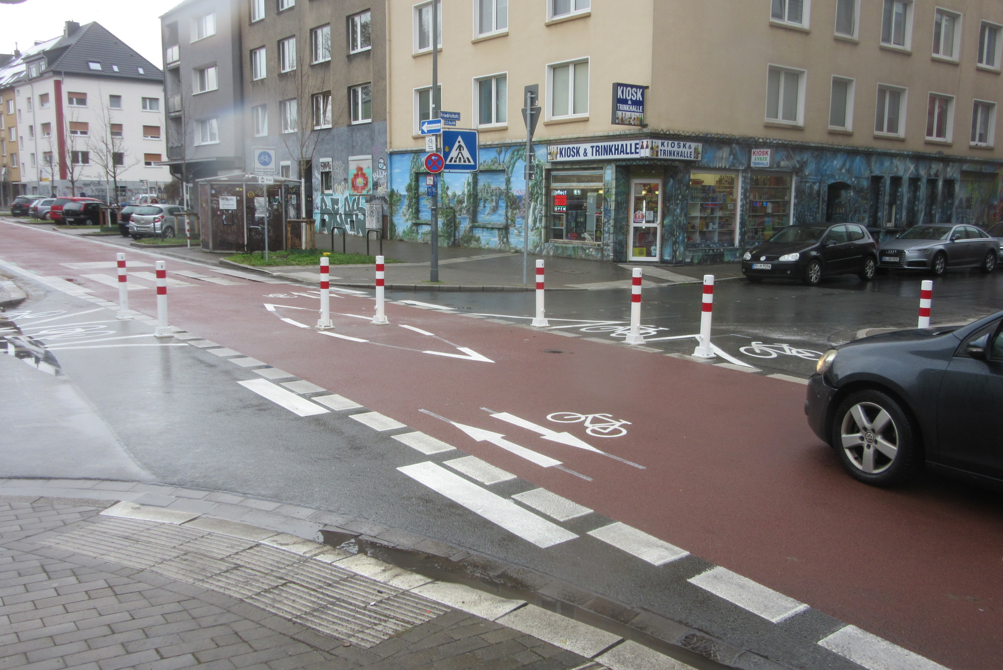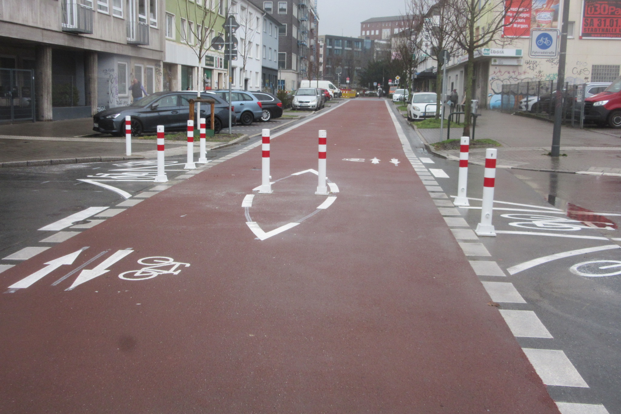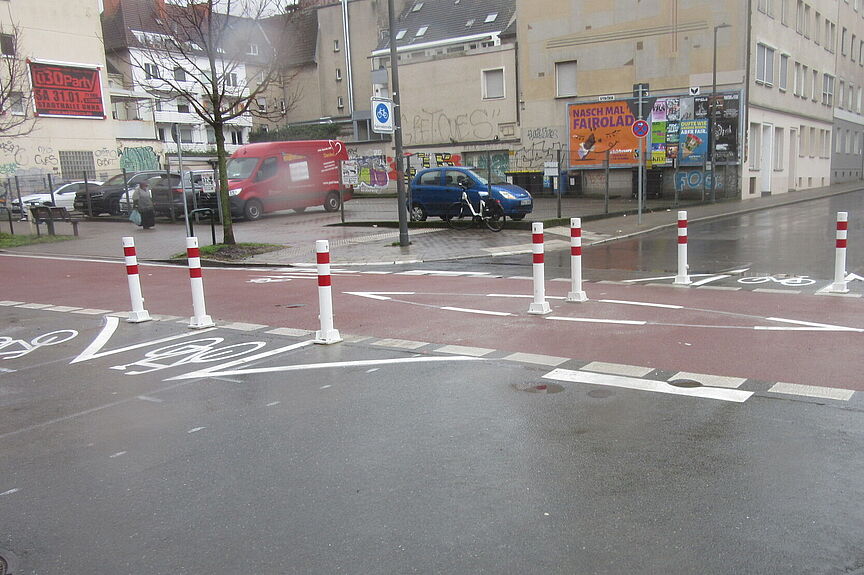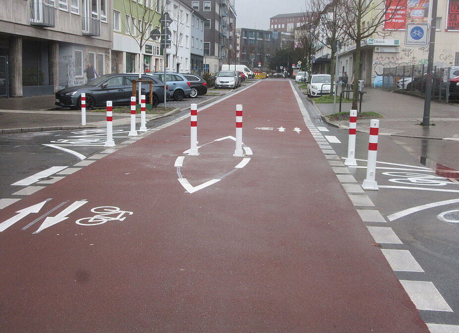 Aktuell wurden auf der neuen Fahrradstraße Lange Straße (zwischen Hoher Wall und Möllerstraße) eine Diagonalsperre erreichtet. Die Sperre besteht aus neun rot-weißen Pfosten in der Kreuzung mit der Friedrichstraße und verhindert Kfz-Schleichverkehr. Radfahrende können sie problemlos passieren. Autos die vom Wallring Richtung Westen zur Möllerstraße fahren müssen vor der Sperre links in die Friedrichstraße nach Süden abbiegen. Auch in Gegenrichtung dürfen KFZ nicht mehr bis zur Friedrichstraße / Rheinische Str. fahren. Der ADFC begrüßt auch, dass Poller auf dem Bordstein angebracht wurde, um das Überfahren des Bordstein zu unterbinden.