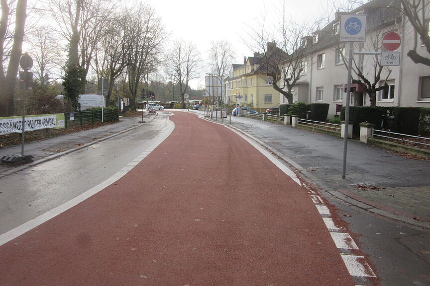 Der erste, rund 300 Meter lange Abschnitt der Veloroute Hörde entlang der Straße Am Bruchheck zwischen Goystraße und An der Goymark ist nun fertiggestellt, als Fahrradstraße beschildert und rot markiert.