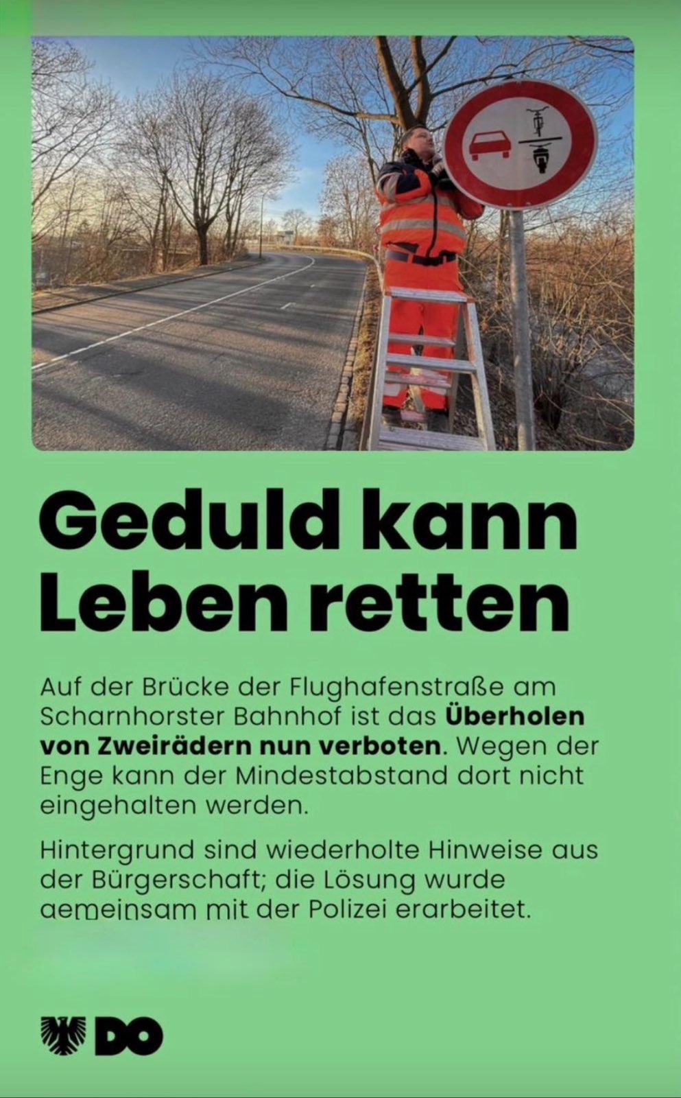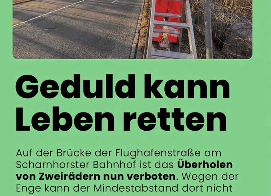 Die Stadt Dortmund setzt erstmals ein neues Verkehrsschild dauerhaft ein. Auf der engen U-förmigen Brücke der Flughafenstraße über die Gleise am Scharnhorster Bahnhof dürfen Zweiräder nicht überholt werden. Damit wird das Fahren auf der Brücke für alle sicherer, so die offizielle Mitteilung der Stadt.